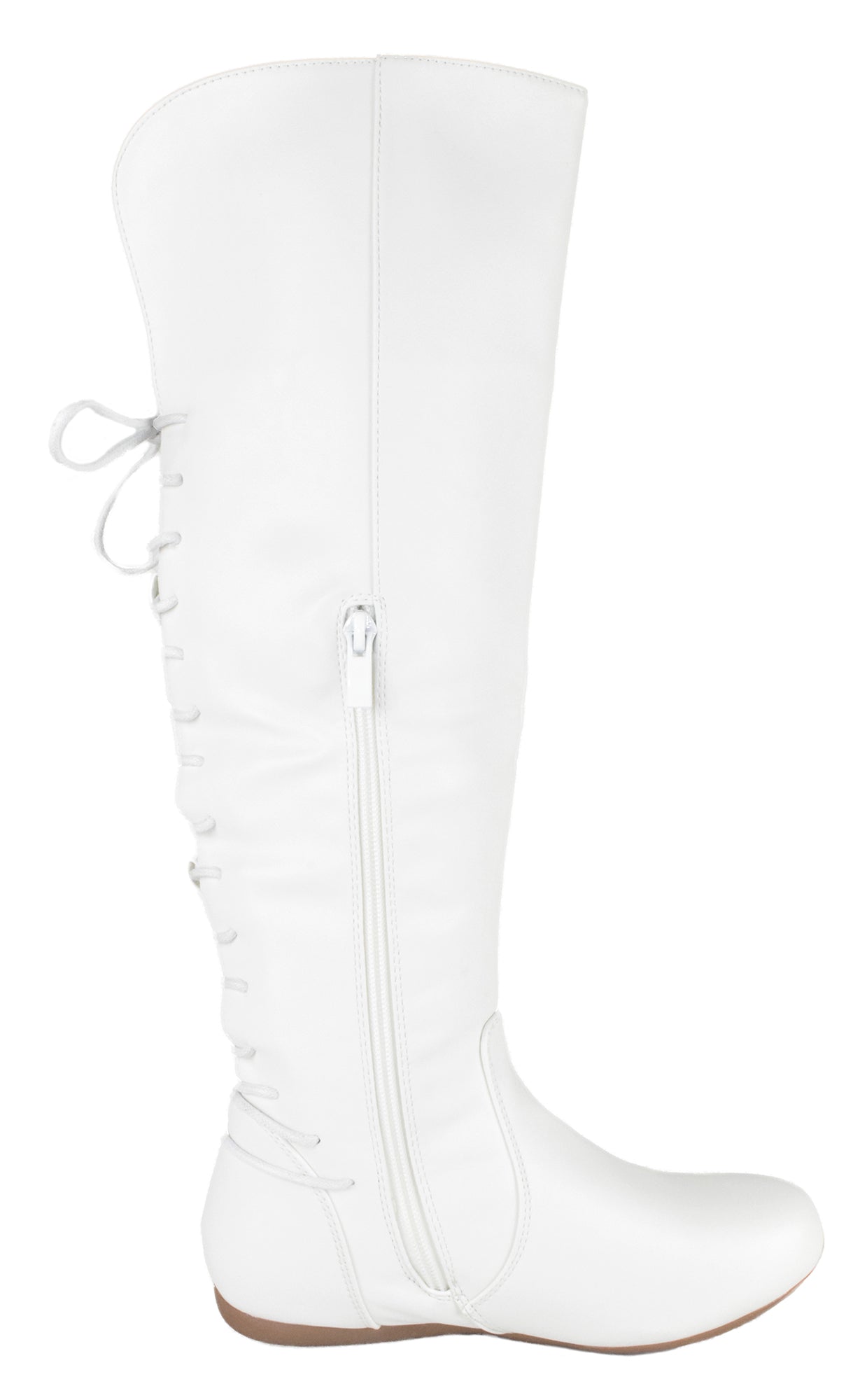 Step up your style with these Top Moda Women Knee High Boots! Featuring a flat heel and back lace design, these boots are both trendy and comfortable. The side zipper and round toe add practicality to the sleek White PU material. Take your look to the next level with BANK-37!