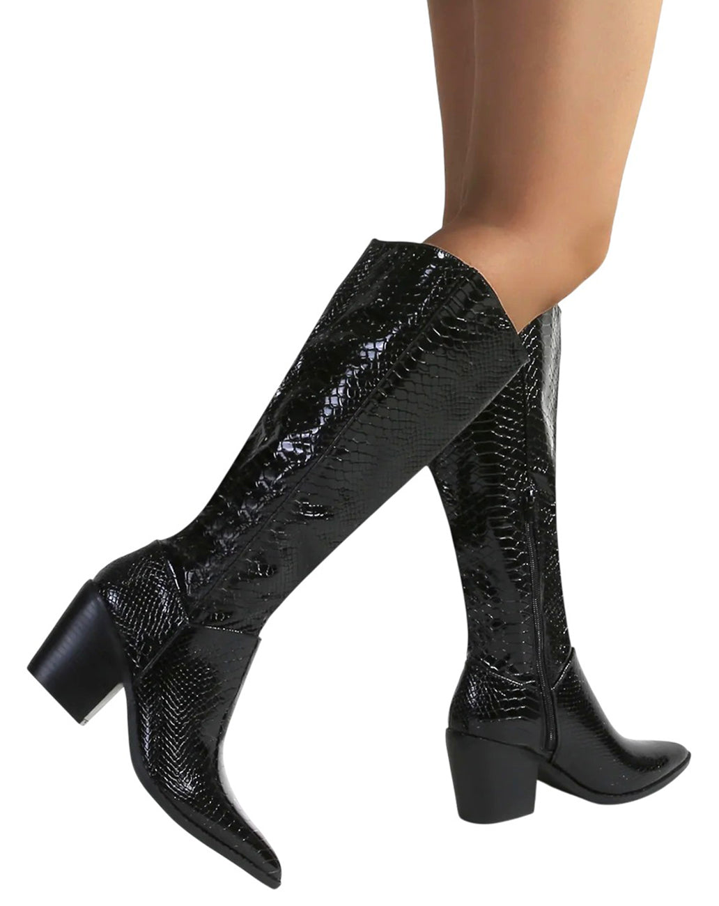 Step into the spotlight with LILIBETH, where Western swagger meets modern edge. These knee-high cowboy boots feature a striking snakeskin print texture that demands attention, paired with a sturdy block heel for all-day comfort and confidence. Side zippers make getting dressed effortless, while the sleek finish works with everything from denim to dresses. Whether you're channeling your inner cowgirl or just want to add some attitude to your wardrobe, these boots deliver serious style with zero fuss.